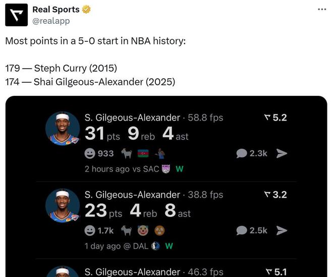 本场比赛结束后,亚历山大在开季前5场比赛已经轰下174分,且球队保持全胜,该数据高居历史第二,仅次于15年库里的179分。